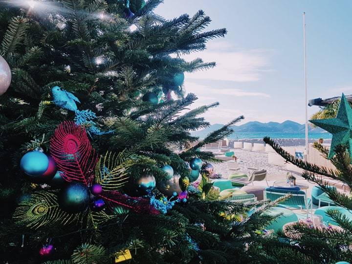 Guirlandes scintillantes, boules de Noël sur chaque table et décorations aux couleurs éclatantes donnent le ton d’un Noël singulier et extraordinaire, face à la baie de Cannes.